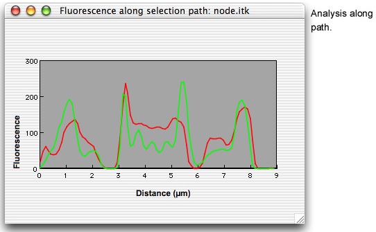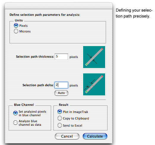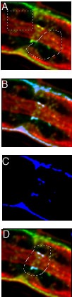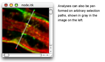 Tools are provided allowing you a great degree of control over which parts of your image are selected for calculation, export or analysis. Left: A: rectangular and arbitrary polygonal selection outlines. B: blue channel used as a pixel-by-pixel selection mask, which can be painted manually or computed by thresholding the red or green channels (2, below). C: blue channel selection mask from B shown in isolation. D: combination of polygonal selection outline and blue selectionmask. Here the pixels were selected by thresholding only that part of the image contained within the polygon. Such selections can be extended into 3 dimensions; ImageTrak also provides automated selection functions to run through a large number of images in a z- or time-series, repeating your pre-determined selection criteria, thus greatly reducing the time required to select complex ROIs in multiple images.